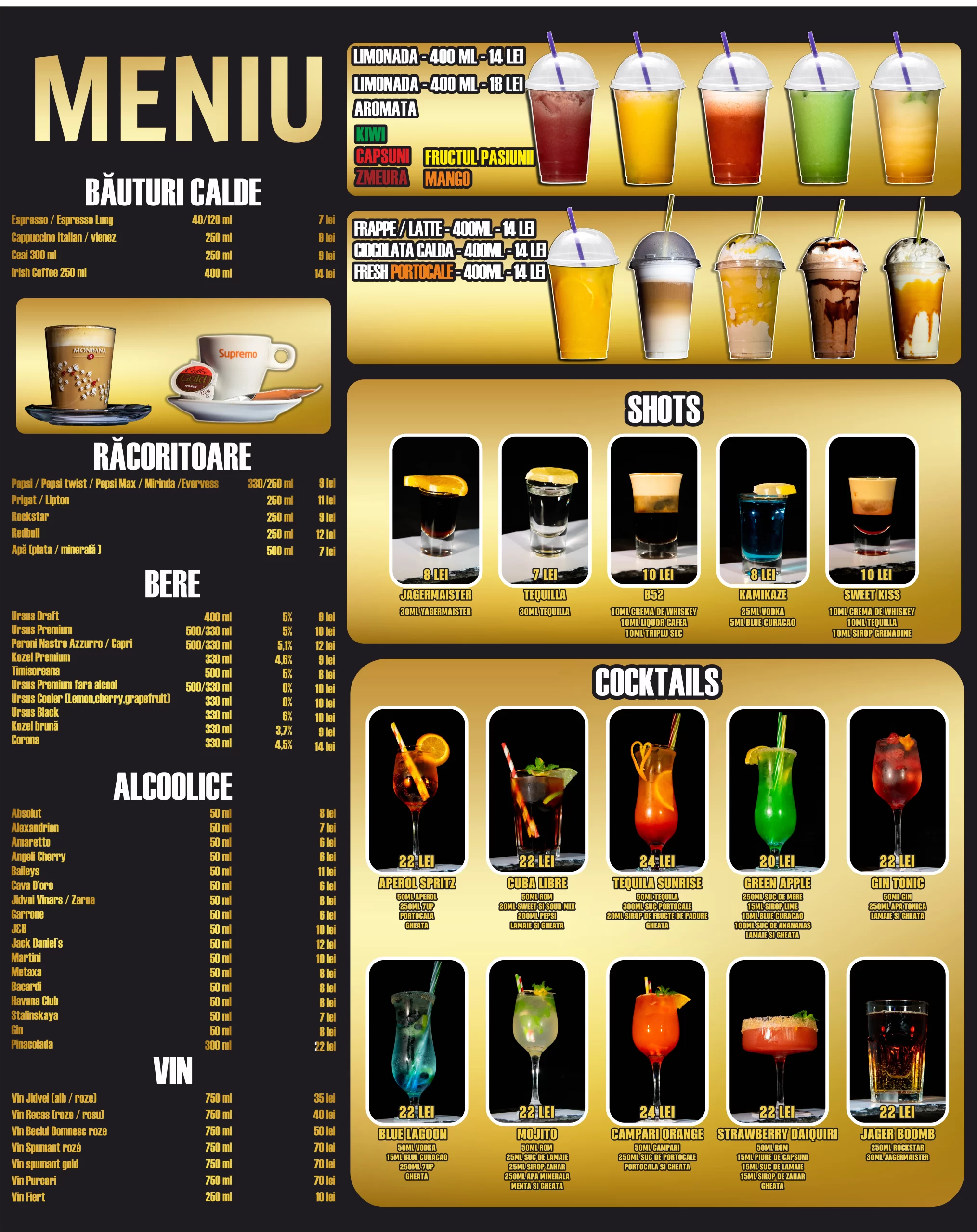 Oferim o selecție variată de cafea premium și cocktailuri, toate la prețuri competitive, reflective ale calității superioare.